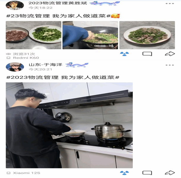 不少学生将自己新学的菜拍照发到家人群、朋友圈,美食引起了朋友亲戚间的共鸣,评论圈有点评、有鼓励、有夸赞……同学们在朋友的赞美中,增进感情;在与亲人的问候中,互贺新年。