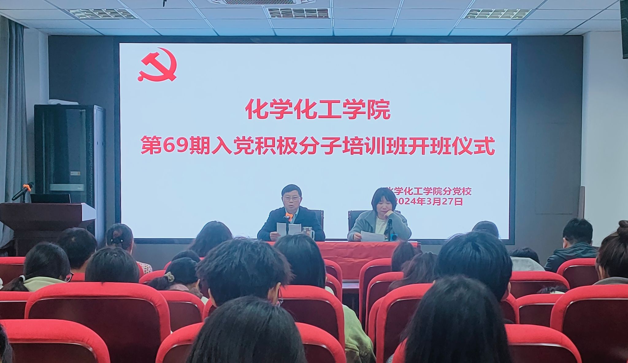 3月27日,化学化工学院于H401举行第69期入党积极分子培训班开班仪式。学院党委书记李新建、各学生党支部书记出席开班仪式。仪式由学院党委副书记、纪委书记鲍青燕主持。