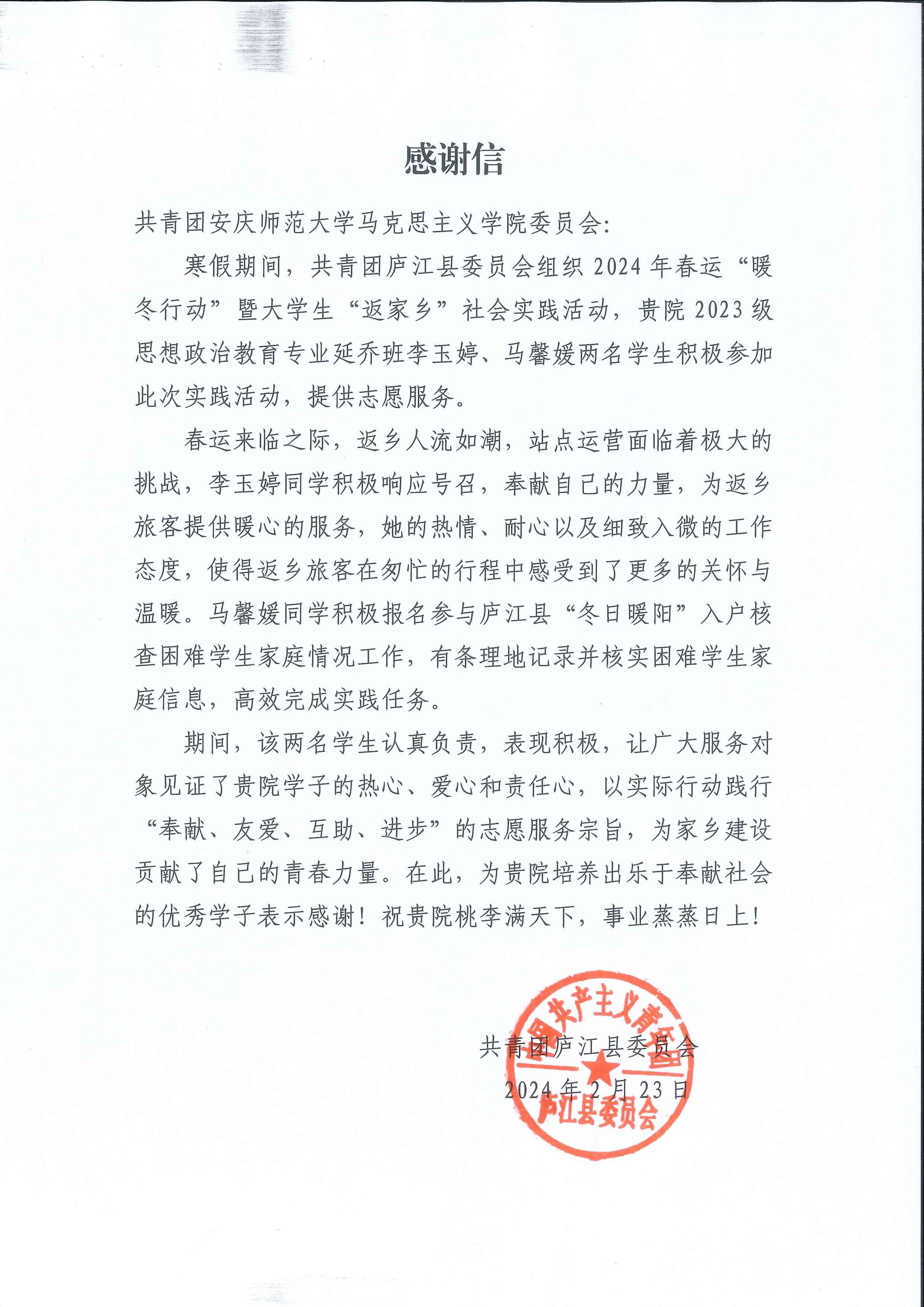 在2024年寒假大学生“返家乡”社会实践中,马克思主义学院积极响应学校号召,加强组织领导,积极引导青年学子返回家乡参与实践服务,在科技创新、乡村振兴、社会服务等各领域各方面工作中争当排头兵和生力军。