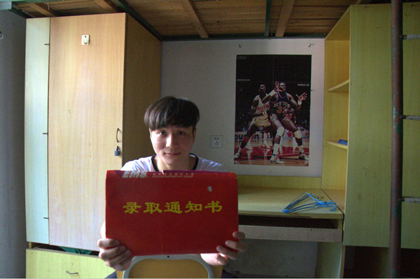 2015年9月11日15级休闲体育新生王俊在宿舍里拿着录取通知书