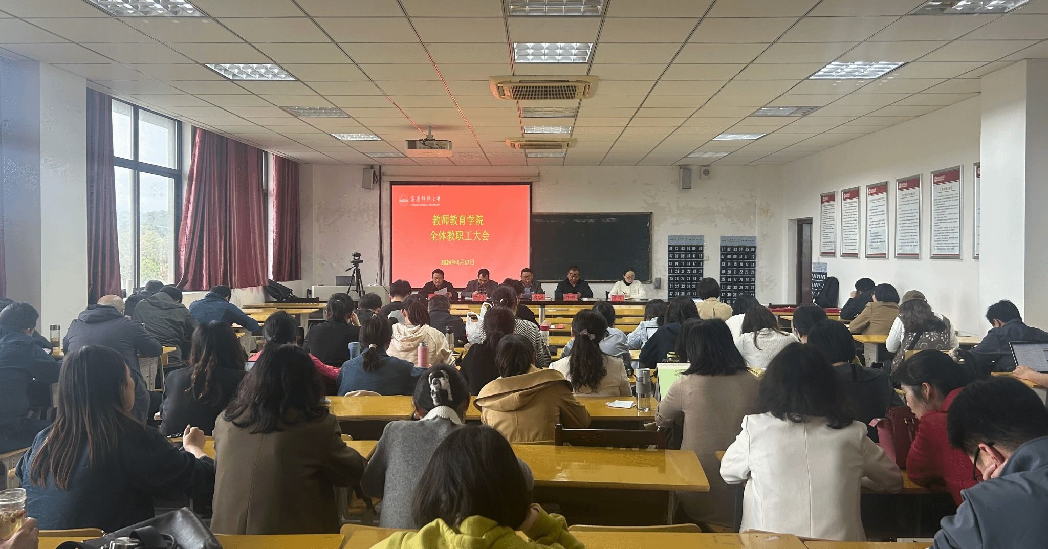 4月17日,教师教育学院在J305教室召开全体教职工大会,贯彻落实学校本科教育教学审核评估迎评动员大会精神,部署推进学院审核评估工作。会议由学院党委书记何孔蛟主持,全体教职工参加会议。