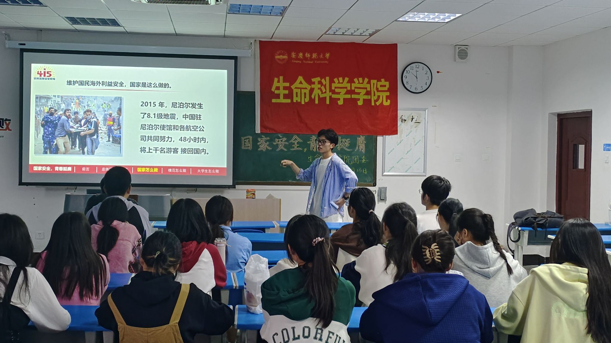 4月13日,生命科学学院在G103举办“国家安全 青春挺膺”主题活动,进一步做好国家安全教育宣传。近百名同学参加活动。