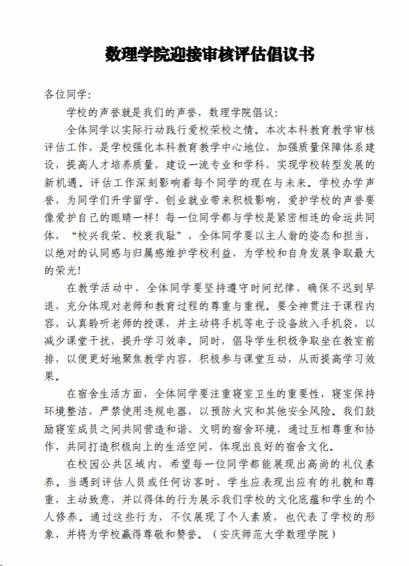 数理学院在学校本科教育教学审核评估工作期间通过各种活动形式充分动员和鼓励学院师生积极参与评估,引导全体学生齐心协力,振奋精神,以迎评为己任,以饱满的精神面貌迎接本次教育教学审核评估。(撰稿、摄影:秦晶晶 编辑:江伟 审核:彭芳珍 赵丽丽)