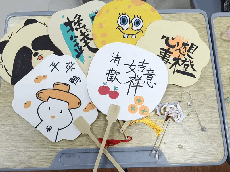 学院还开展了“妙手生花,感恩同行”特色活动。同学们纷纷展示自己的才艺,有的在团扇上绘制图案,有的巧手编织精美的扭扭棒手工艺品,还有的细心制作刻纸艺术作品。活动结束后,同学们将自己的作品作为礼物赠送给辛勤工作的宿管阿姨们,以表达感激之情。