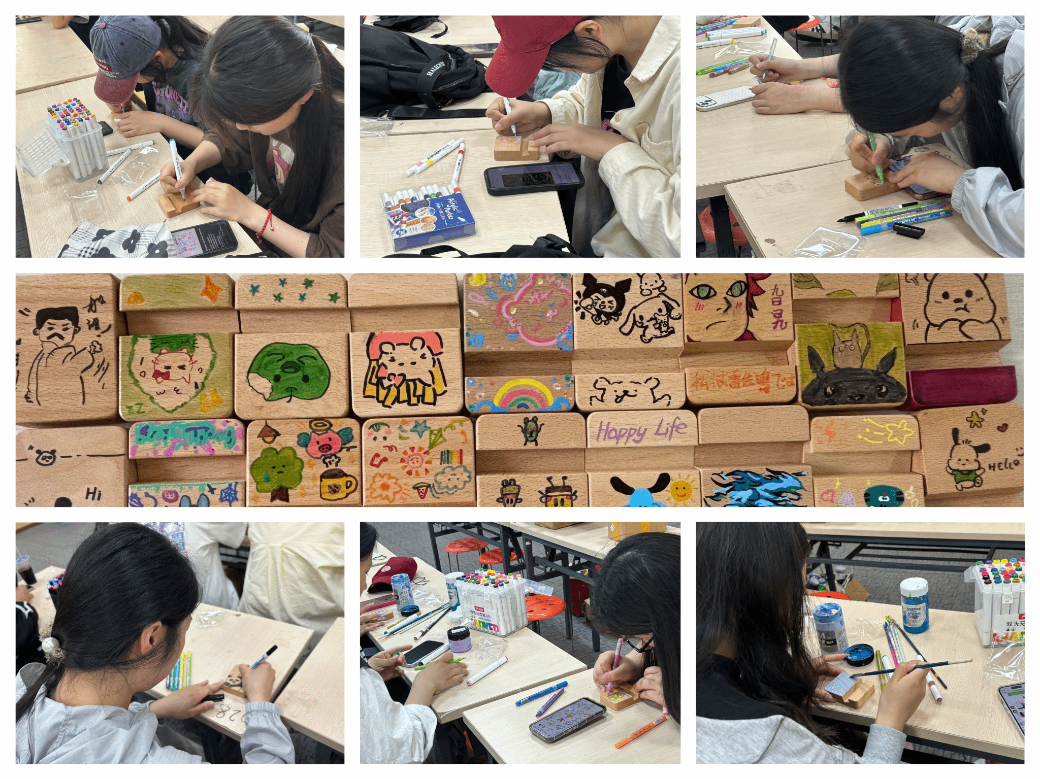 以浅色马克笔起形,分区域填色,柔和的色彩在木制手机支架表面“碰撞”,形成了风格独特的DIY手绘支架。4月27日,美术学院开展“笔尖流转,约‘绘’美好”活动,50余名学生齐聚学院学术报告厅,在手机支架的方寸间开启创作之旅。