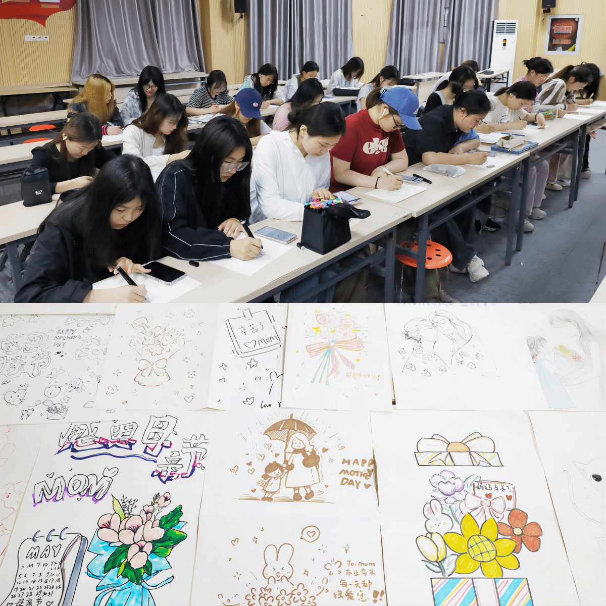 5月11日,在母亲节来临之际,美术学院开展“情暖五月天,绘在母亲节”活动,30余名学生齐聚学院学术报告厅,以画笔和画纸精心为母亲准备了一份独特的节日礼物。