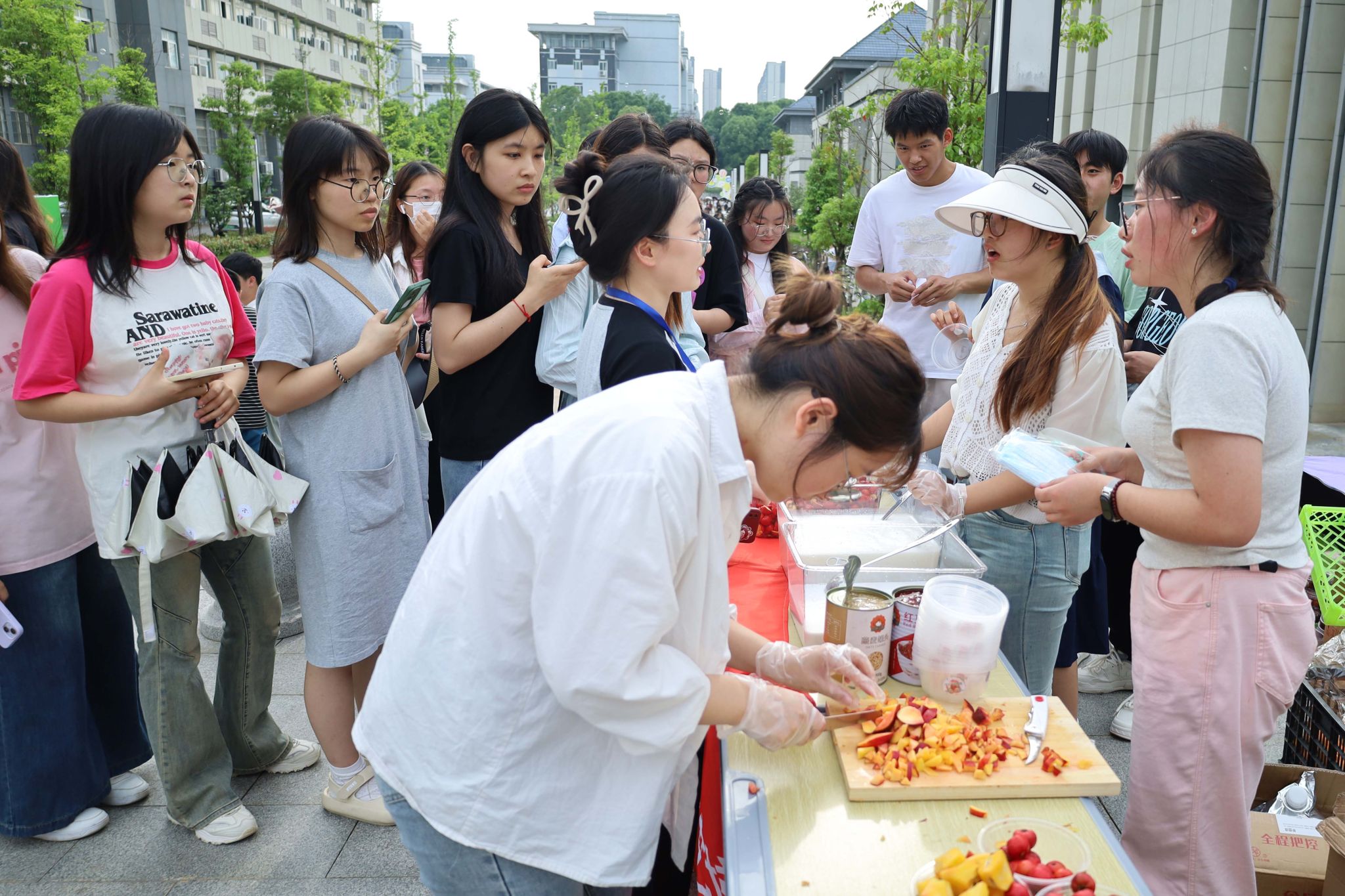水果洗净切块,分装整齐摆放,酸奶、麦片等小料详尽展示,大学生创意食品工艺协会会长、生物科学专业2021(3)班的高茂林组织协会成员分工合作。“学生需先参与套圈活动,然后排队于前台领取或者制作水果捞。”她坦言,不论是游戏还是制作,参与学生都会进行交流,这是一定的人际关系拓展,有助于提升学生的心理适应能力。