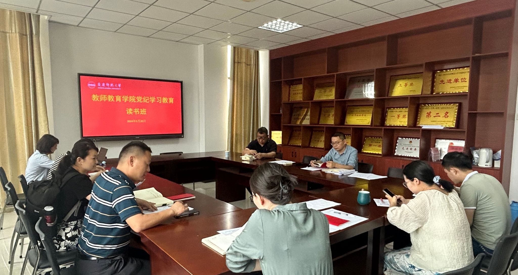 5月20日,教师教育学院党委在J202会议室举办党纪学习教育读书班,深入学习习近平总书记关于加强党的纪律建设的重要论述,认真学习《中国共产党纪律处分条例》,增强政治定力、纪律定力、道德定力、抵腐定力。会议由学院党委书记何孔蛟主持,学院全体党委委员、党支部书记、辅导员参加会议。