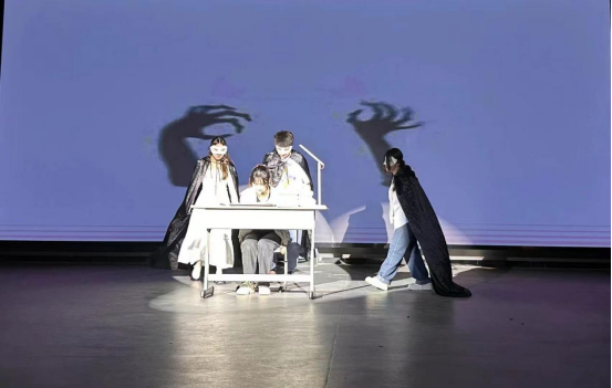 比赛现场气氛热烈,来自不同团队的精彩剧目逐一登台亮相。教师姚强诚指导的剧目《长路漫漫》采取全新的表演形式,在传统心理剧的基础上,运用“魔幻商店”表现技术,增加了女巫与机器人等元素,使剧本情节新奇有趣。同时,为深入探究主角的内心,编剧设置了一个“超我”的角色与主角对话,采用内心独白和情景对话等多元的表演形式,搭配灯光,为观众带来身临其境般的视觉体验。