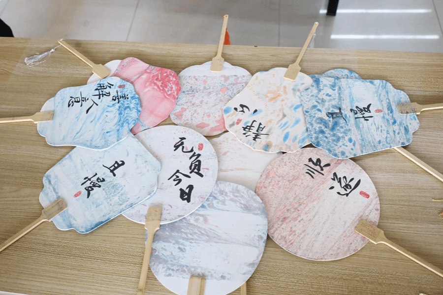 “漆扇使用的是漆艺中的‘漂漆’技法,利用了漆不溶于水的特点,辅以点、甩、弹、划等手法,在水面绘出图案效果制作而成。”财务管理专业2022(3)班的汪子奇一边往水中滴入色漆一边向围观的学生介绍到。她表示,漆艺作为非物质文化遗产,是中国传统工艺文化的重要组成部分,漆艺历史悠久、技艺独特,具有深厚的文化内涵和艺术价值。
