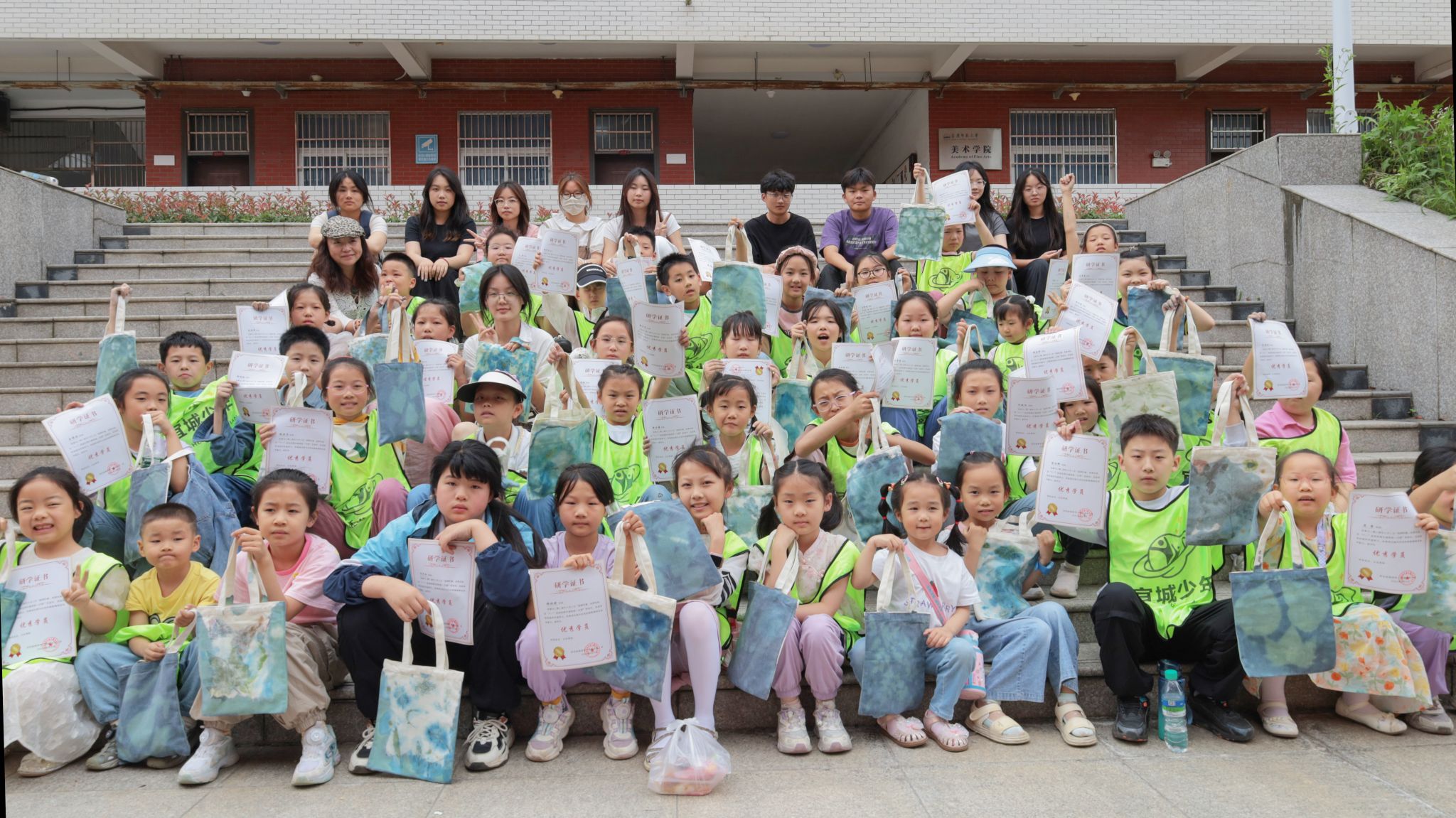 6月2日,美术学院在学院学术报告厅开展“自然的印记·借光行动”——“蓝晒植物拓印”手工公益志愿活动,一群学生志愿者带着44位小朋友,以树叶为素材,利用蓝晒与拓印技艺,在纯色帆布包上留下了独特的印记。