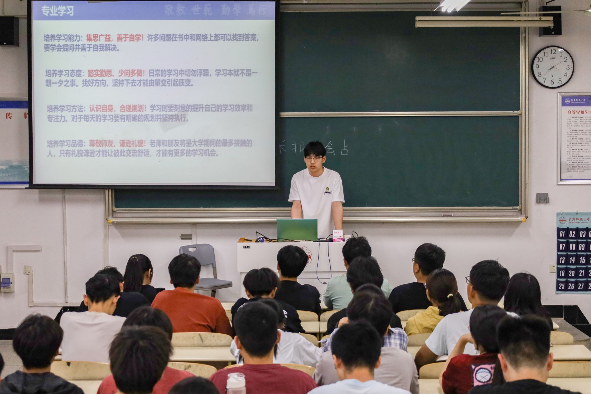 物联网工程专业2020级的周宇手持粉笔,在黑板上为同学们梳理出大学各个阶段及其需要完成的任务。他从担任班干角度讲述了自己如何平衡学习与工作,如何带领班级营造优良学风的故事。他告诉同学们要正确认识学习与工作的关系,合理分配时间并善于利用碎片化的时间,保持高效的学习和工作状态。