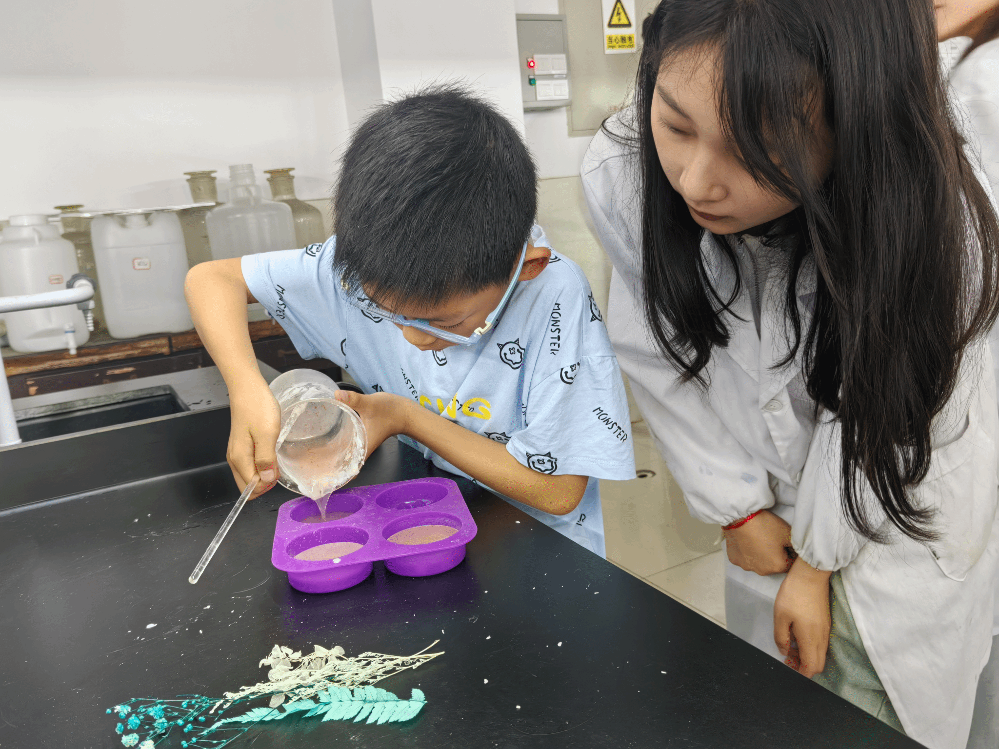 “将每种白蜡称量融化,加入精油搅拌,倒入模具,再摆上干花,这样绿色、环保、无污染的香薰蜡片就完成啦……”6月1日,化学化工学院实验室里热闹非凡,40余名不同年龄段的小朋友和家长们齐聚一堂,共同制作香薰蜡片,解锁儿童节新体验。