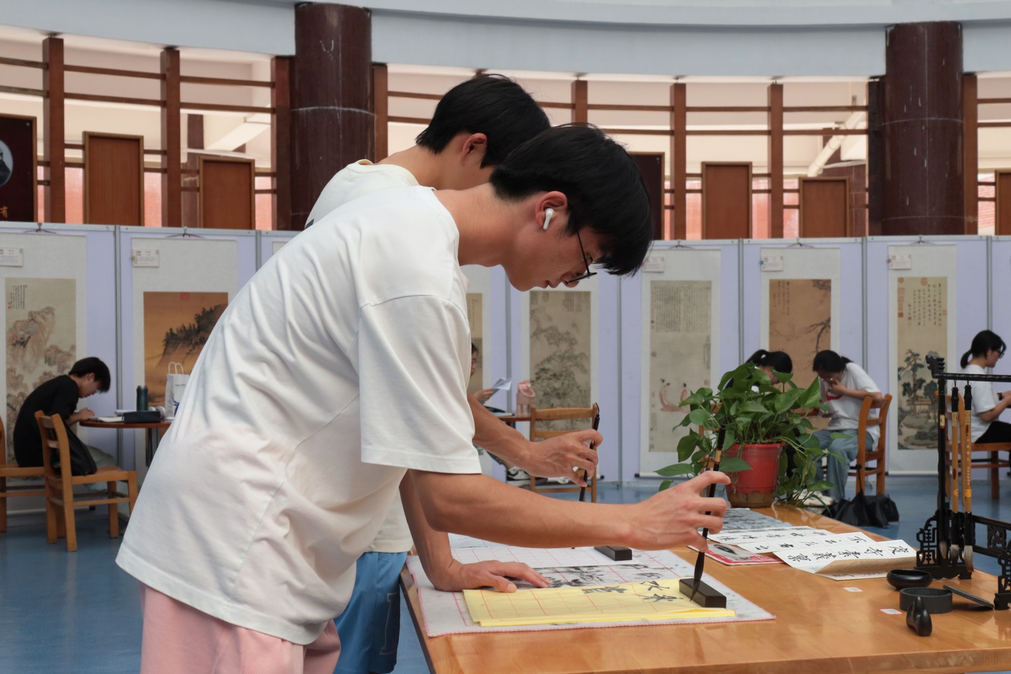 用浓墨蘸取的毛笔在宣纸上挥毫,一幅秀丽的字画逐渐诞生……了解到本次展览活动设有“翰墨流香——书法”单元,汉语言文学专业2023文典班的宣昕特意从菱湖校区赶来。在他看来,书写的过程仿佛是自己在与笔墨共舞,与历史对话,与文化交流。“学习书法有利于培养我们的意志力和耐心。”宣昕坦言,通过学习书法,学生可以更好地了解和传承中华优秀传统文化,增强民族自豪感和文化自信心。