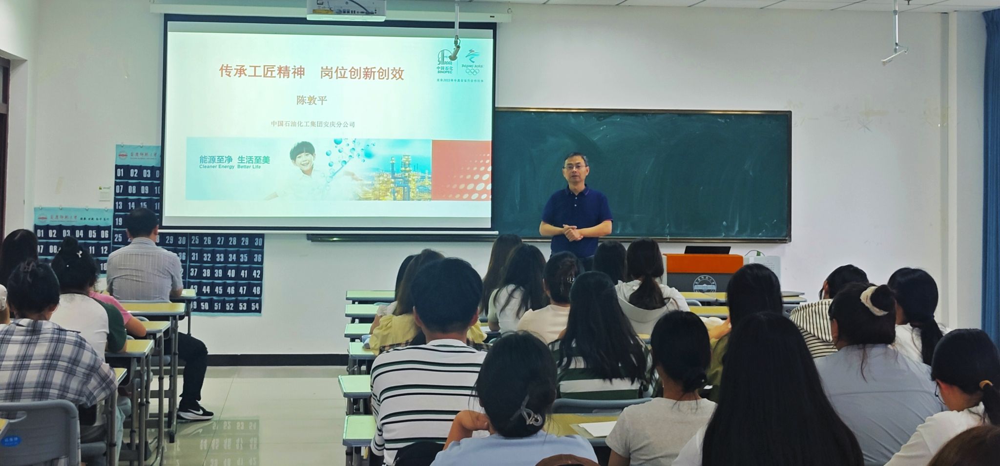 陈敦平为同学们详细介绍了安庆石化公司的企业沿革与后续转型发展,同时分享了自己从初级工到特级技师、技能大师近四十年的成长经历,为同学们展现了自己的初心与追求。他语重心长地说,要像一颗小小的螺丝钉一样,牢牢扎根在自己的岗位,不让自己生锈,始终坚定如新,努力贡献自己的力量。“一名工匠应当具备高度的责任心,几十年如一日专心把事情做到极致,在实践中练就高超技能,更要不断打破固化思维,勇于创新突破。”陈敦平认为,作为一名企业工匠,要着眼于企业的发展方向,做创新发展的探索者,开拓创新思路。他通过分享许多工匠前辈的事迹,号召同学们要爱岗敬业、刻苦钻研,用实际行动践行工匠精神。