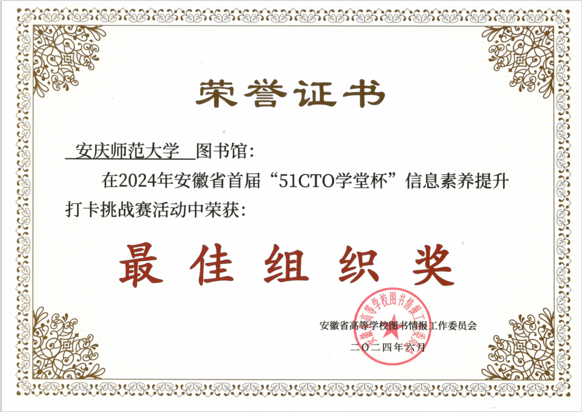 由安徽省高等学校图书情报工作委员会主办的安徽省首届“51CTO 学堂杯”信息素养提升打卡挑战赛日前圆满结束。本次大赛中beat365官网董雨欣同学荣获一等奖,李树雪同学荣获二等奖,汪涛、张庭、张雨涵、俞浩然同学荣获三等奖,戴静荣获“优秀指导教师奖”。在此次比赛中beat365官网参赛人数和获奖成绩在全省各院校中均居前列,图书馆获得“最佳组织奖”。
