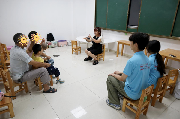 观察老师肢体动作后,队员姚响芮发现音乐课的两位小朋友在家长的带领下顺利做出了指定动作。“老师进行的教学是通过引导式教育让自闭症儿童逐渐参与到音乐活动中来,帮助他们建立情感联系,发展社交技能,并提高他们的表达能力和沟通能力。”作为“小老师”,她表示在课堂上观摩到了许多宝贵的经验,小朋友们的配合让她对自己今后的音乐课程设计增添了信心。