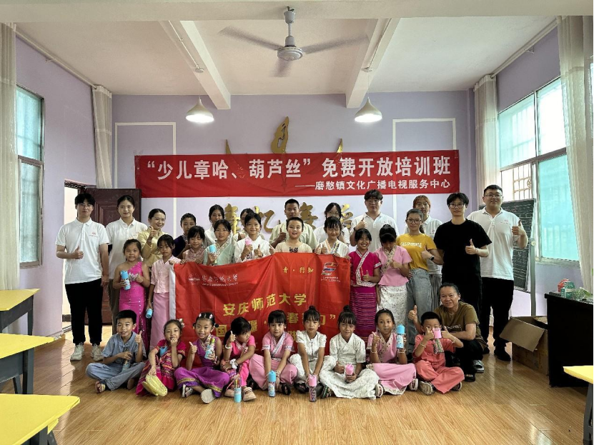 “树上的鸟儿成双对,绿水青山带笑颜,从今不再受那奴役苦,夫妻双双把家还……”一曲经典的黄梅戏《天仙配》选段缓缓流淌而出,原来是实践团成员在课余时间为大家带来了作为安庆特色文化名片的黄梅戏艺术。随后,实践团成员与授课老师共同为大家吹奏葫芦丝。汉族小朋友与傣族小朋友手牵手,共同学习,共同歌唱。实践团成员说道:“我们是56个民族同呼吸、共患难,‘你中有我,我中有你,谁也离不开谁’的命运共同体,今天这场跨越地域与民族的文化盛宴,成为了连接不同民族情感的纽带,让彼此的心灵更加贴近。”