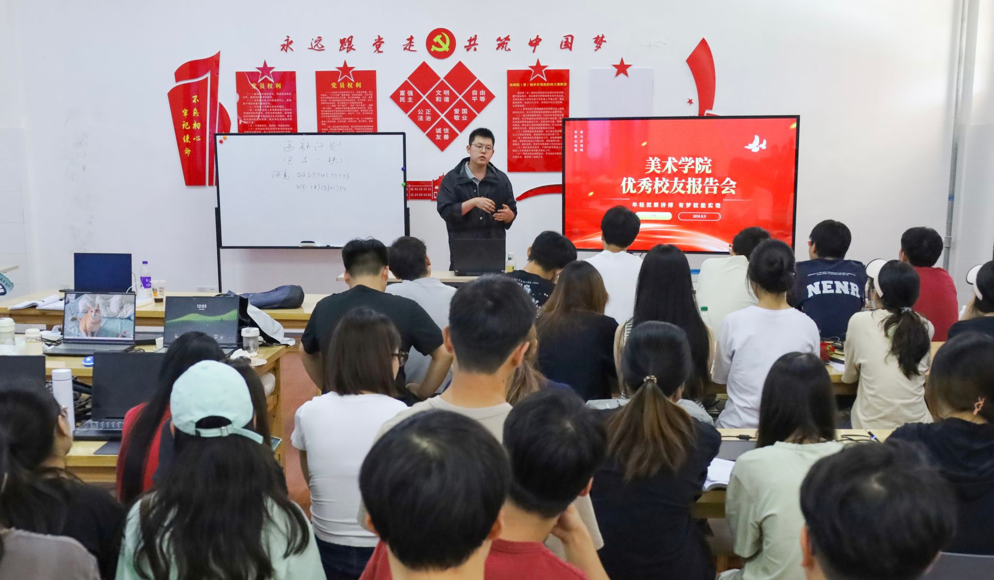 9月5日,美术学院举办校友报告会,邀请学院2022年西部计划志愿者、2022年校“十佳青年”、2022届美术学专业优秀毕业生许竟回校交流座谈,分享参与“西部计划”的相关经验。美术学院2021级50余名学生代表到场聆听。