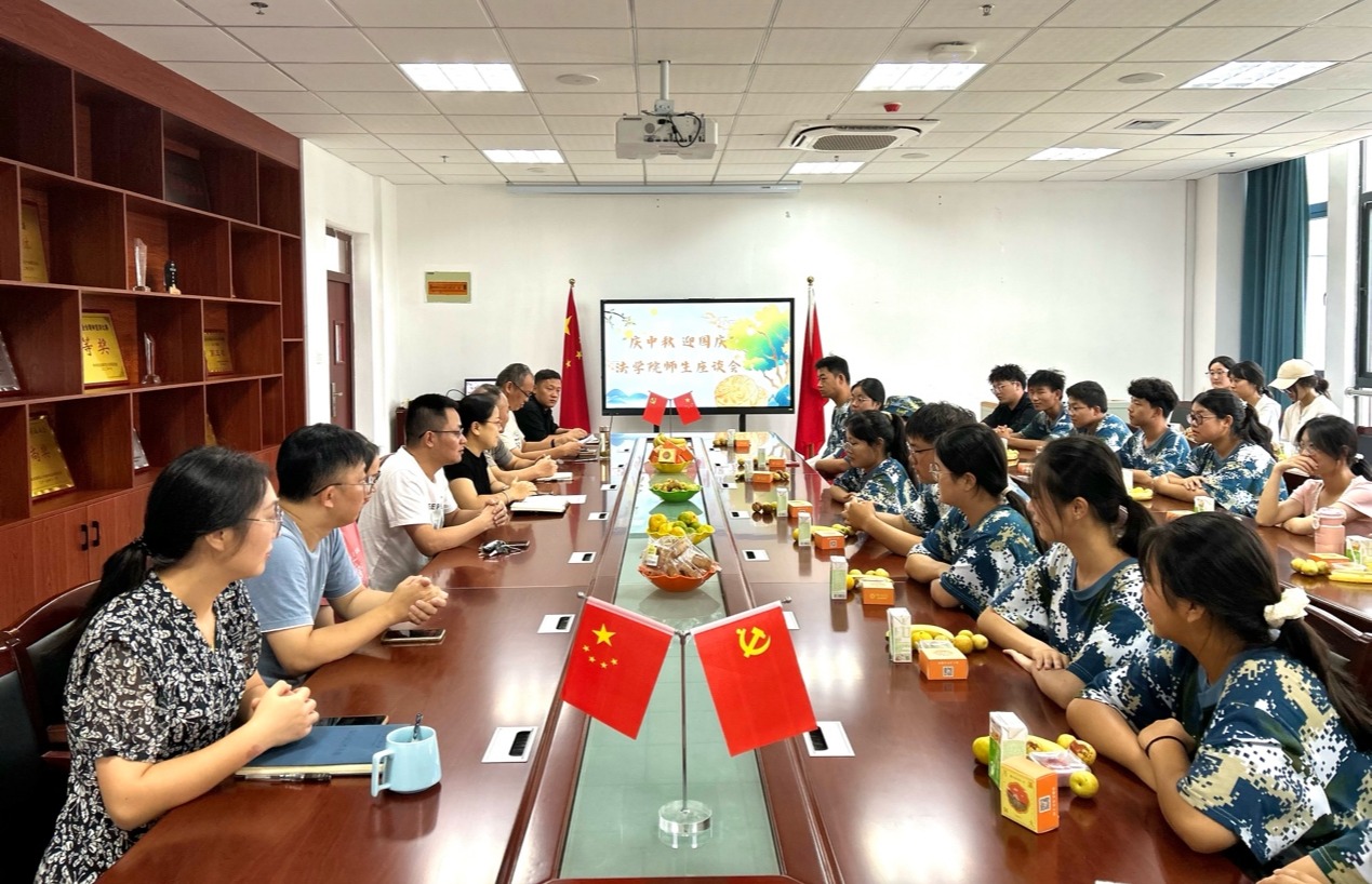 9月13日,法学院在301会议室召开“庆中秋,迎国庆”师生座谈会。法学院副院长朱留虎、党委副书记钱敏、副院长崔汪卫出席会议。学院新进教师代表、2024级新生辅导员以及来自安徽、河北、陕西等省学生代表参与本次座谈会。会议由钱敏主持。