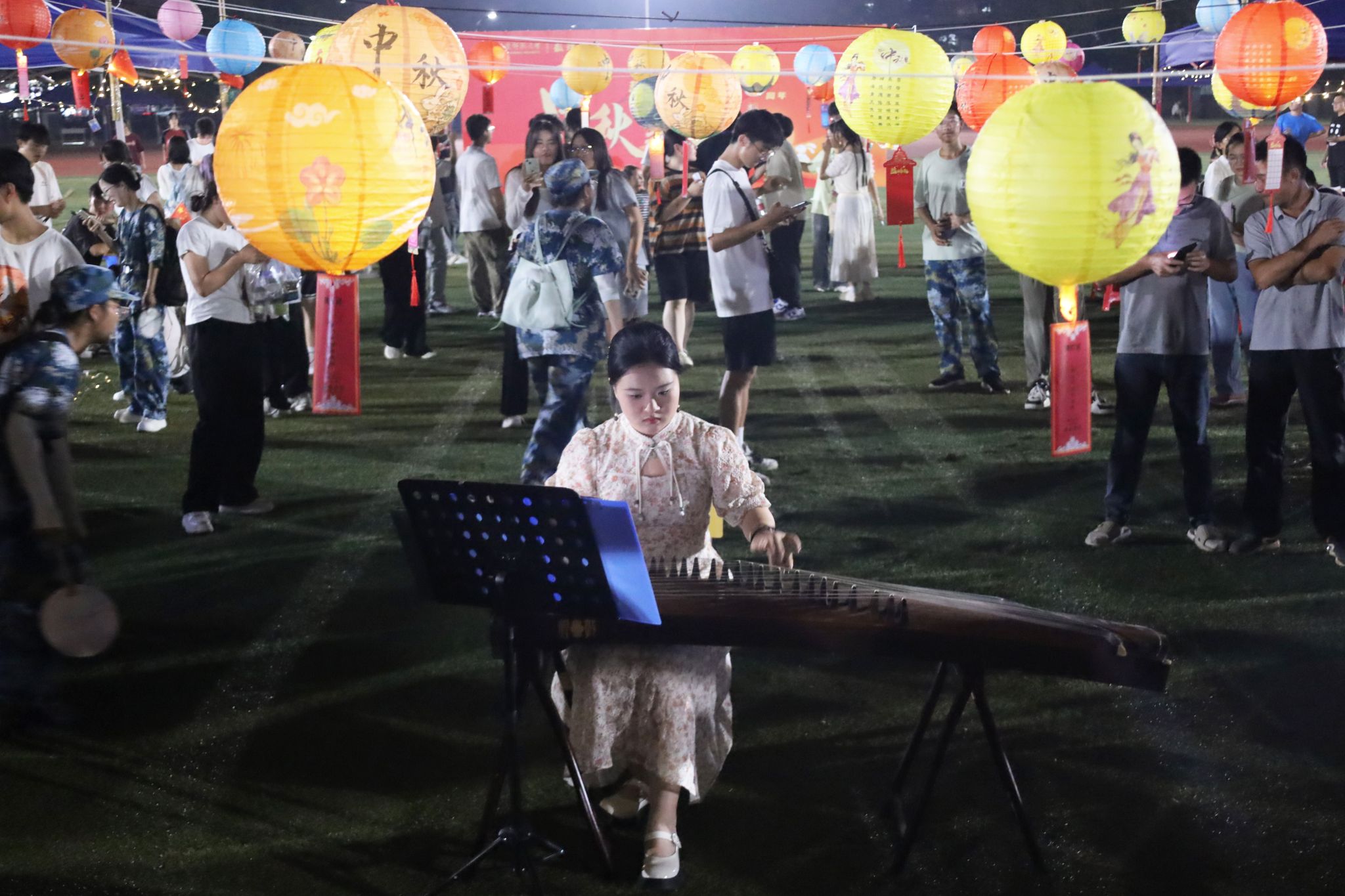 舒缓弦乐,曼妙舞姿,独奏《花好月又圆》飘逸悠扬,舞蹈《长安啊》尽显中华文化之美,丰富的主题表演吸引众多师生纷纷驻足。汉服NPC提问,民风乐器试弹,天体讲解观测,猜灯谜……从拍照打卡到创意手工,从音乐欣赏到知识解答,各协会“特色摊点”推出系列活动,师生们“沉浸式”游园,共度中秋之夜。