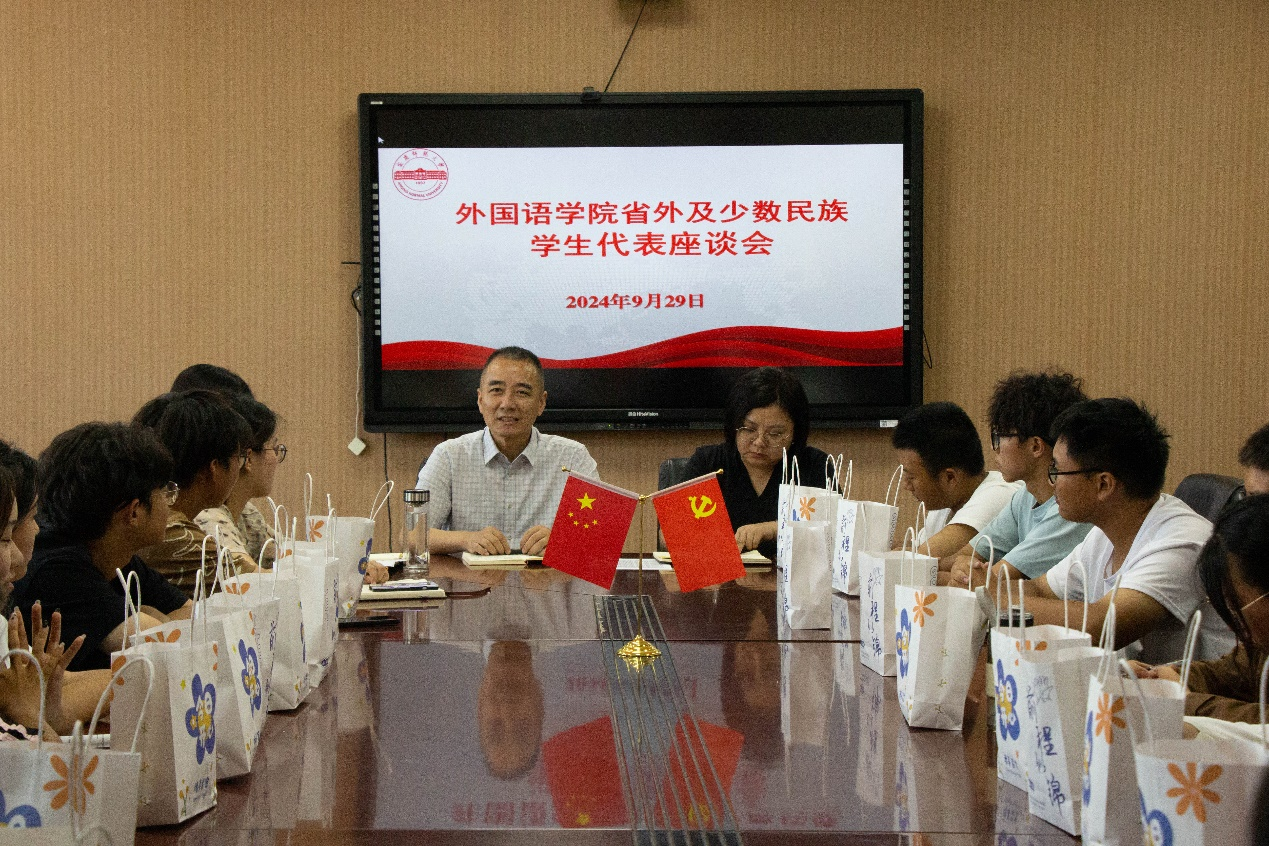 近日,外国语学院召开省外及少数民族学生代表座谈会。外国语学院院长江加宏出席座谈会,新生班辅导员、2024级省外新生和学院少数民族学生代表参会。会议由外国语学院党委副书记何媛君主持。