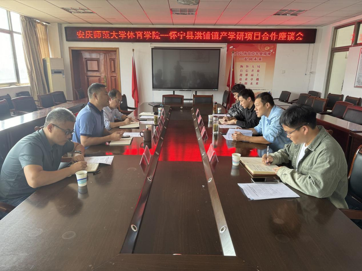 汤霖一行对体育学院的热情接待表示感谢,对体育学院的办学成果和社会服务表示赞赏,介绍了怀宁县洪铺镇地方基本情况,表达了在乡村振兴、人才培养、赛事活动等方面的需求。