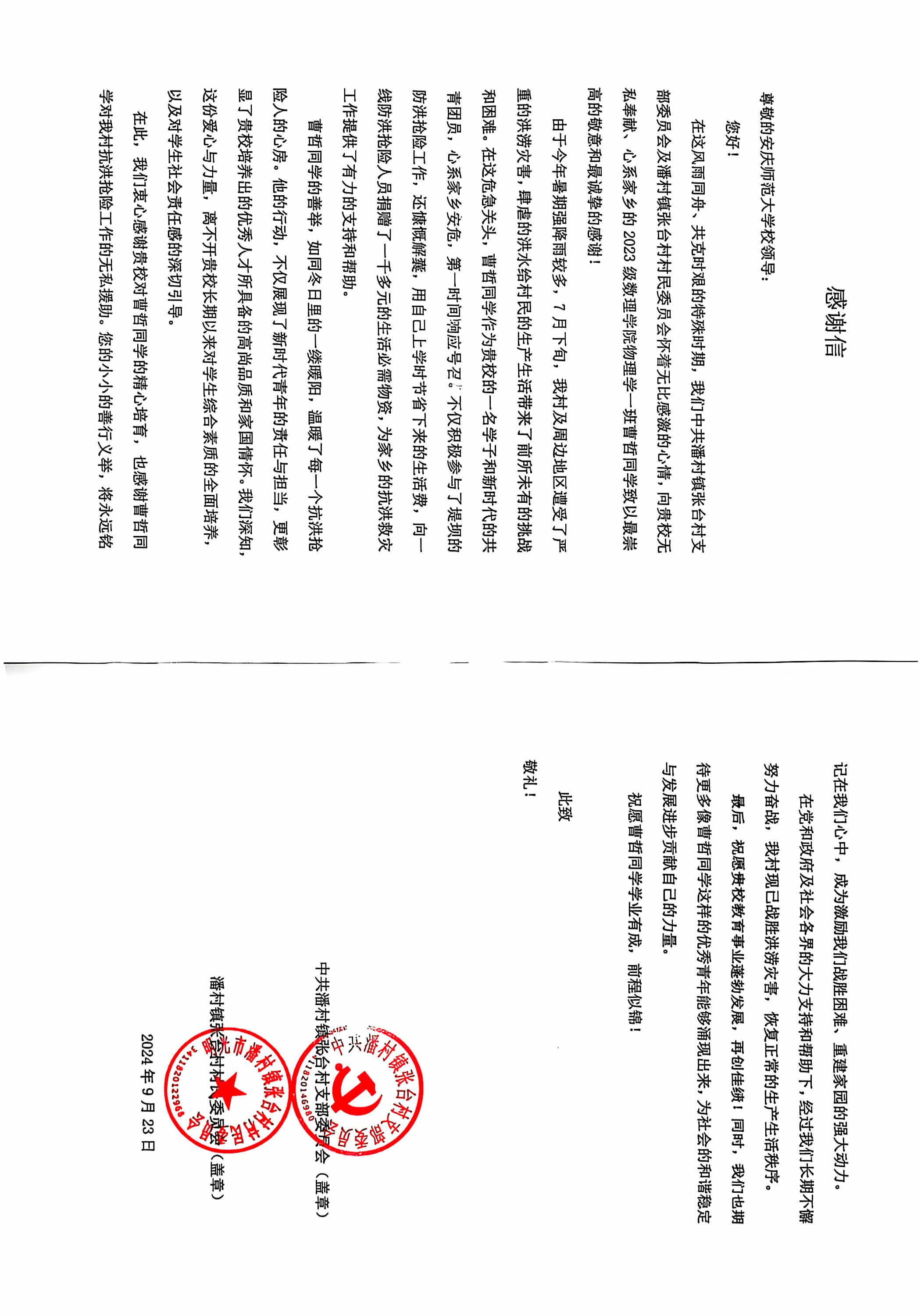 10月14日,数理学院收到了一封来自安徽省明光市潘村镇张台村党支部的感谢信,信中对该院2023级物理学专业1班曹哲同学在今年夏季防汛救灾工作中所展现出的勇敢担当、无私奉献和高度的社会责任感表示深切的敬意和衷心的感谢。
