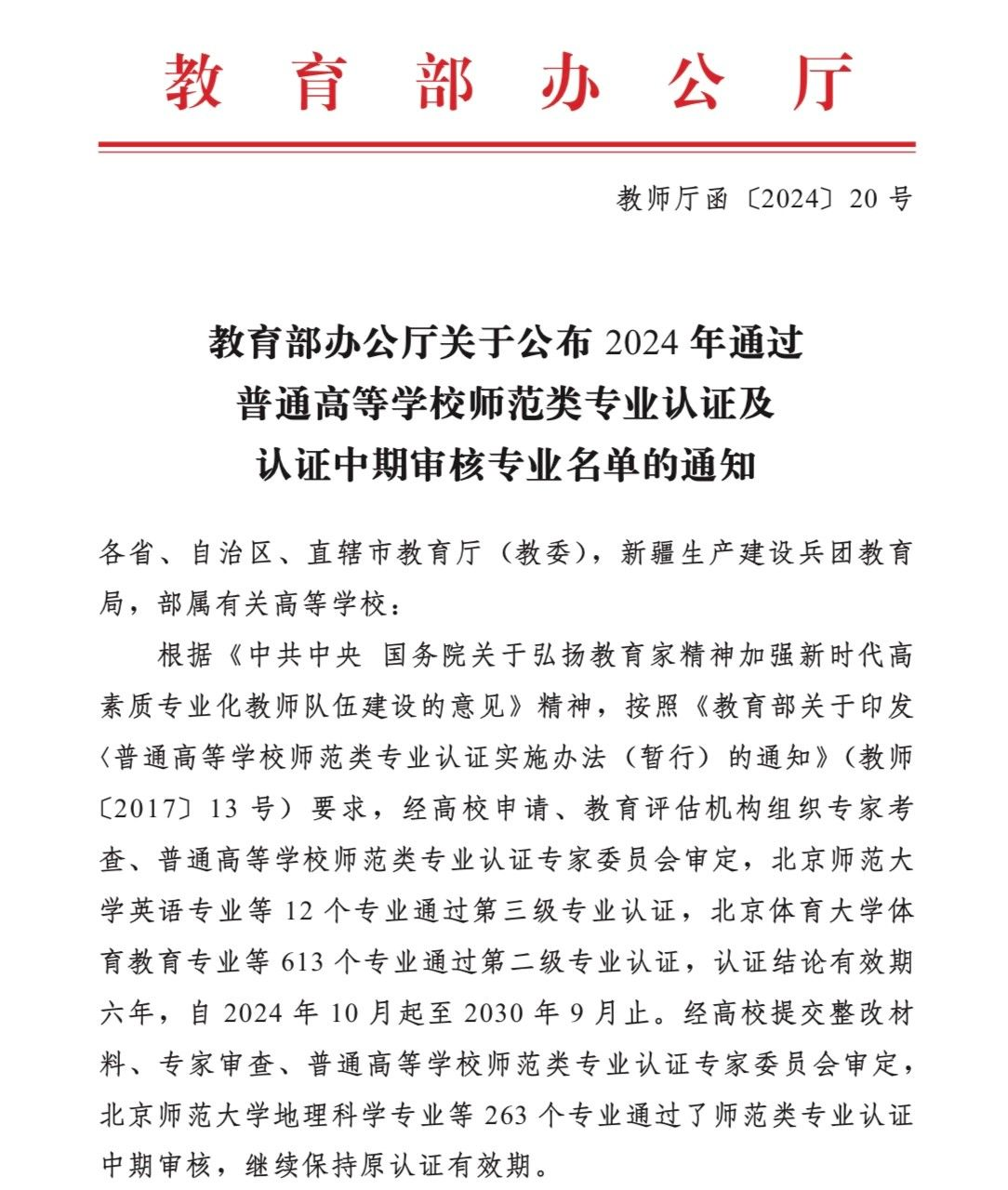 近日,教育部办公厅公布2024年通过普通高等学校师范类专业认证及认证中期审核专业名单,beat365官网地理科学专业有条件通过教育部师范类专业中学教育第二级认证。通过第二级认证专业的师范毕业生,可由高校自行组织中小学教师资格考试面试工作。本次认证通过是对beat365官网地理科学专业建设成效的充分肯定。