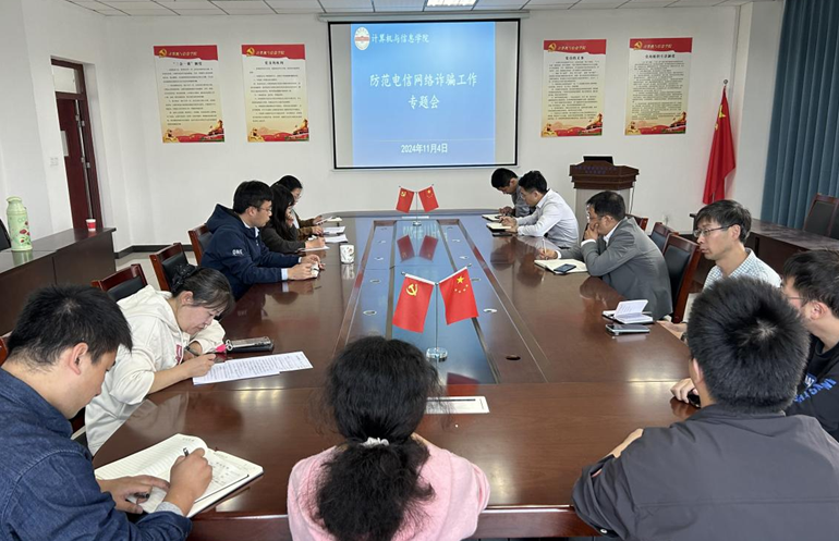 11月4日,计算机与信息学院召开防范电信网络诈骗工作专题会,部署和安排防范电信网络诈骗工作。计算机与信息学院党委副书记刘燕杰主持会议,全体专兼职辅导员参加会议。