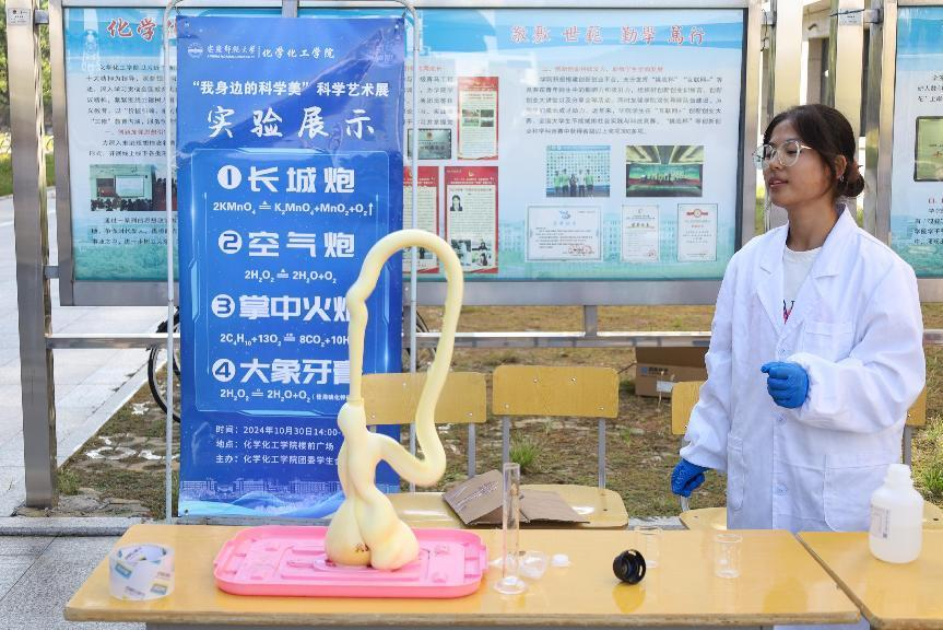 广场的另一侧,“长城炮”“空气炮”“大象牙膏”和“掌中火焰”趣味实验正在火热上演。化学(师范)专业2024(1)班的王悦悦身穿白色实验服,用洗洁精水充分浸湿双手与小臂,捧起加入了丁烷气体的泡沫。打火枪一经点燃,火焰瞬间从她的掌心窜出,这一景象赢得了围观学生的阵阵惊呼。“火是生活中很常见的事物,我希望通过这个关于‘火’的实验,能够激发学生们对化学的兴趣。”王悦悦表示。