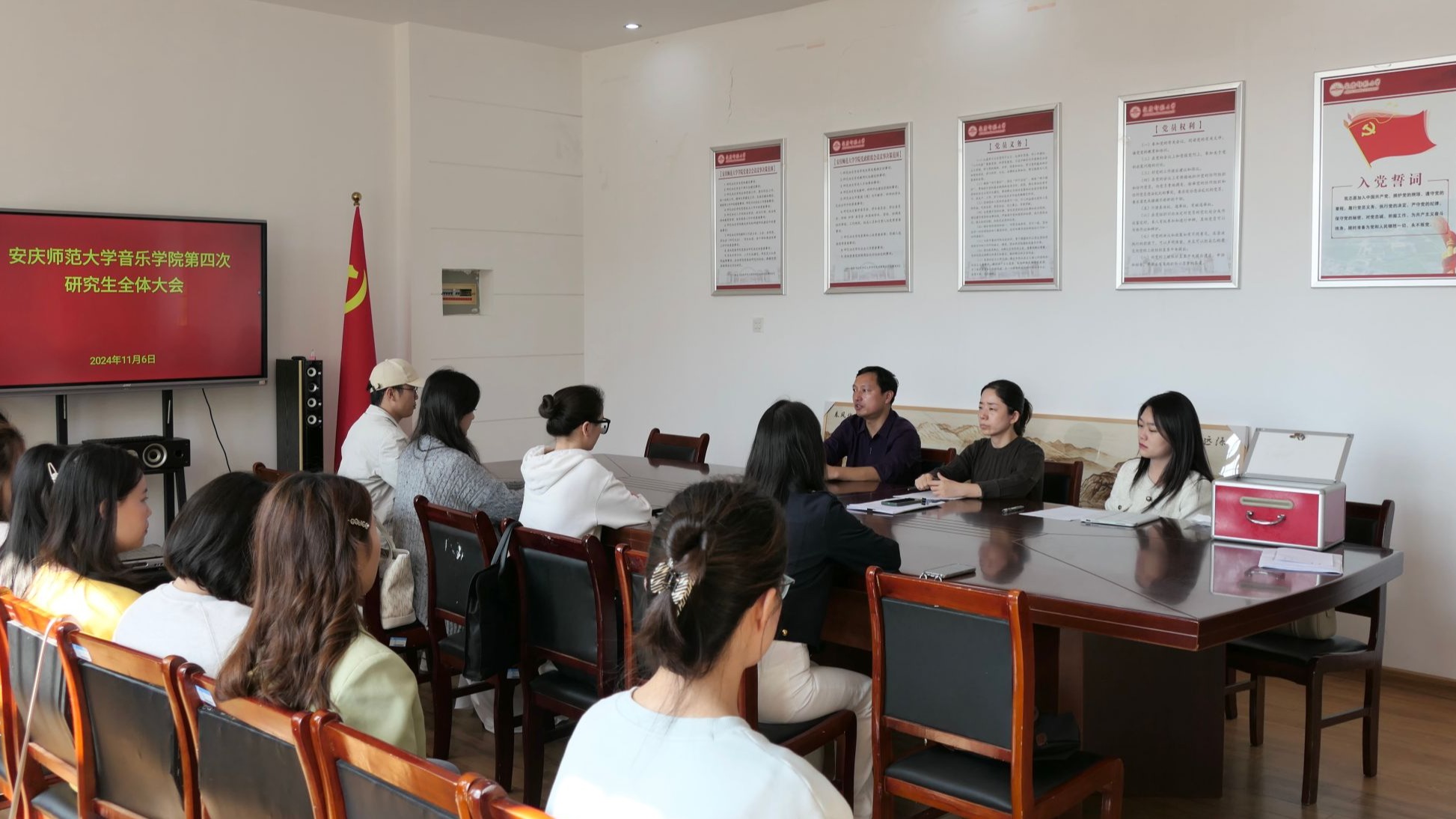 11月6日,音乐学院第四次研究生全体大会在庄严的国歌声中拉开帷幕。音乐学院党委副书记肖之进、院团委负责人及全体研究生参加大会。