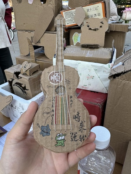 在学校的东苑食堂外,同学们带着自己改造后的快递盒来到现场并进行展示,活动现场气氛热烈非凡。在制作过程中,同学们充分展现出了非凡的创意。有同学利用多个纸盒搭建了一个精致的吉他模型,有同学将纸盒改造成了可爱的小动物,更有创意十足的同学把废纸盒变成了笔筒、收纳盒等实用的物品。参与活动的同学兴奋地表示:“这次活动很有趣,在制作的过程中,同学们一起讨论、一起动手,感觉时间过得特别快。而且看到自己用废纸盒做出的作品,特别有成就感。”