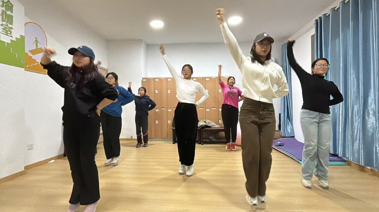 “天空的雾来得漫不经心,河水像油画一样安静,和平鸽慵懒步伐押着韵……”跟随音乐节奏律动,计算机类专业2024(11)班朱博凯或退或进,手臂左右变换,从最初的动作生疏逐渐变得流畅。“刚开始看到一屋子的女生,我心中‘望而却步’,每一个动作都很僵硬,但很快我就被音乐的节奏和大家的热情所‘点燃’。”朱博凯坦言,这种“舞动青春”的氛围很“解压”,这是他第一次“沉浸式”体验一场广场舞“盛会”,心中所有的烦恼和不愉快都随着舞动的过程逐渐消散。
