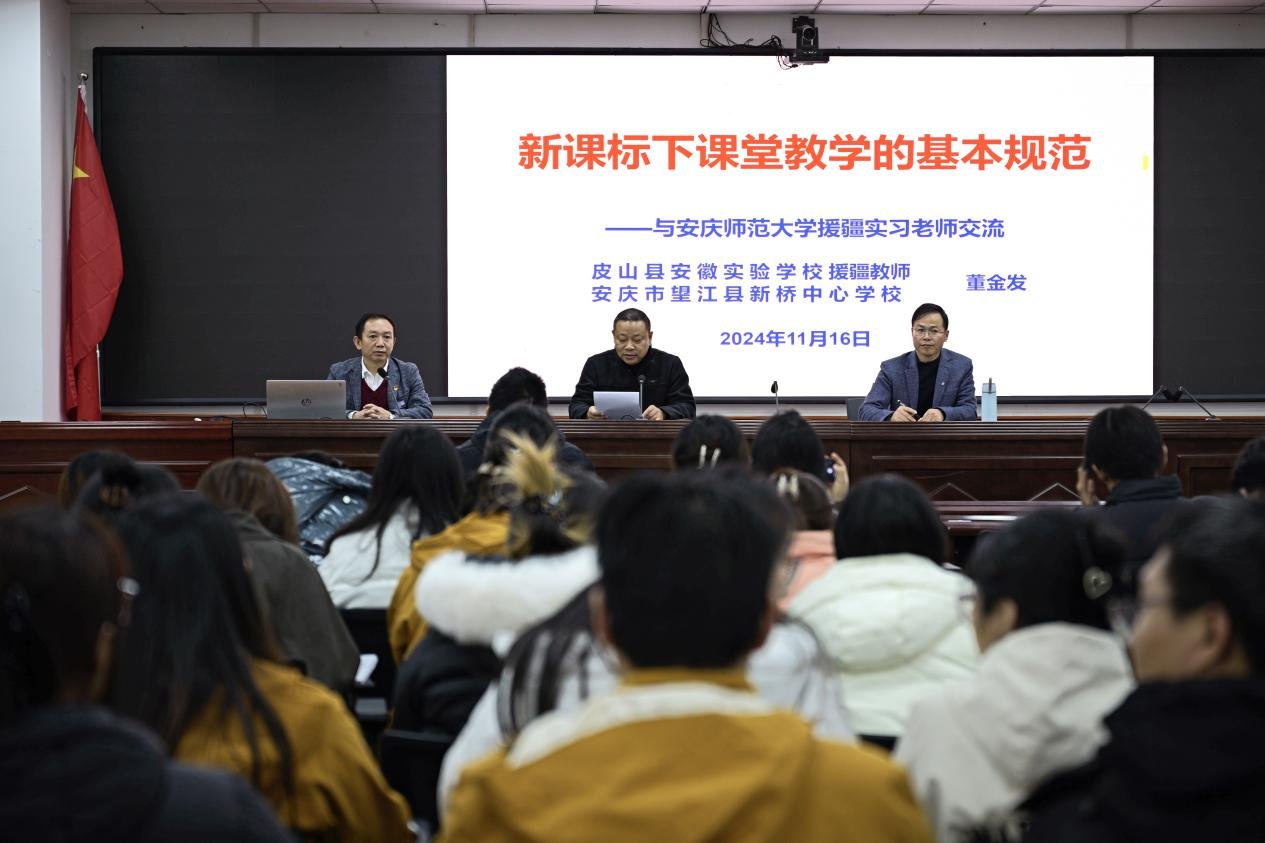 11月16日,beat365官网数理学院校友、安庆市“名师工作室主持人”、援疆教师董金发受邀在皮山县安徽实验学校为援疆支教志愿服务队做《新课标下课堂教学的基本规范》专题报告。报告会由援疆支教志愿服务队领队朱灵群主持。