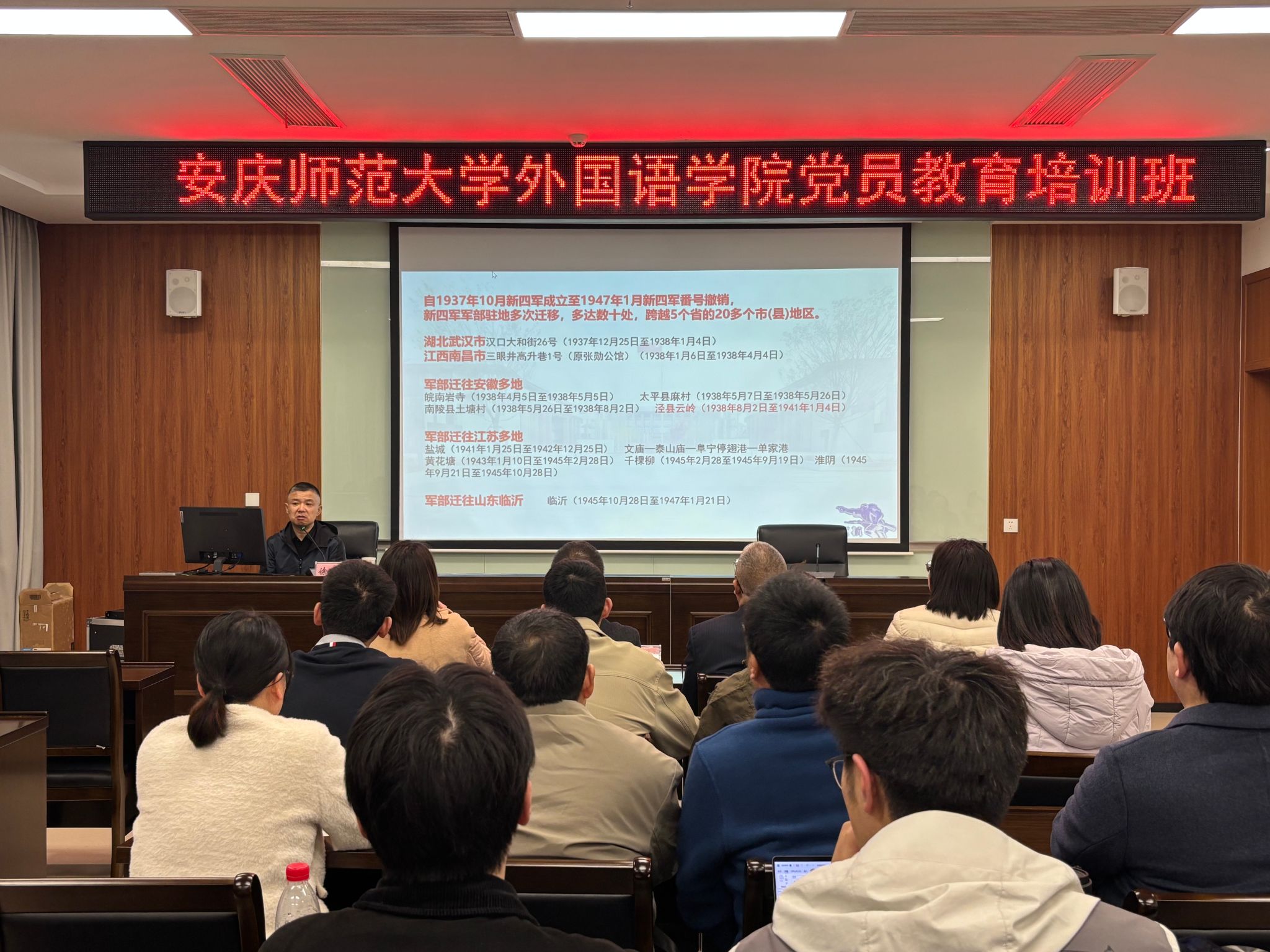 泾县县委党校副校长徐朝刚应邀为师生党员作“缅怀新四军精神,赓续革命传统”专题党课培训。徐朝刚深入讲解了新四军成立背景、历史贡献及“铁军”精神内涵,展现了新四军以信仰为旗帜、以革命为生命的精神光辉。解读了新时代党的建设的新要求,强调党员干部要加强党性修养,增强政治定力、纪律定力,严守纪律规矩、锤炼道德品格、筑牢防腐防线。会上,师生党员聆听了“在炮火中诞生”的军歌,深刻感悟到革命信仰如何在枪林弹雨中淬炼成钢。