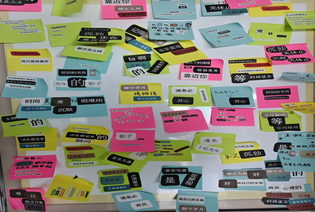 挑选心仪贴纸、唤醒自我灵魂、拼贴“我”之关键词、感悟“我”之真谛……工作人员引导学生使用拼贴素材在便利贴上进行创作,同学们充分展示自己天马行空的想象,凑出人生的关键词。物流管理专业2023级(1)班的郑嘉豪同学表示:“在寻找对应贴纸和思考如何用其表达自身想法的过程中,让我在释放情绪压力的同时体验到了诗歌的韵味和美感。”工商管理类专业2024级(3)班的王轩宇在完成拼贴后兴奋地说到:“通过这次活动,不仅让我感悟了诗歌之美,还让我结识了一群志同道合的朋友。”