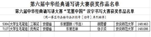 日前,中华经典诵写讲“笔墨中国”第六届汉字书写大赛获奖名单揭晓,人文学院2022级汉语言文学专业胡思睿、张子贤的作品分别荣获大学生毛笔组三等奖和优秀奖。