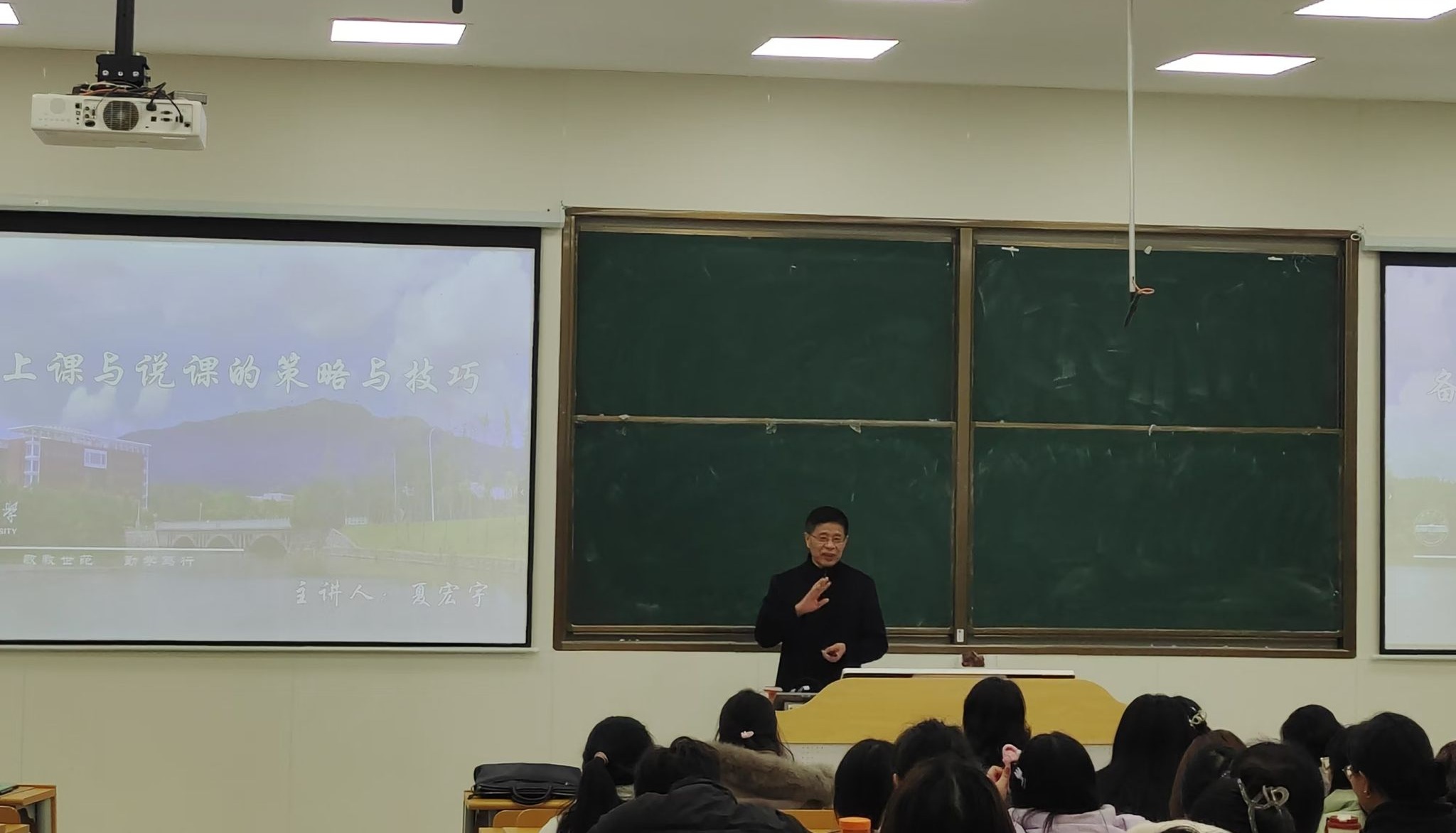 夏宏宇教授以“备课、上课与说课的策略与技巧”为主题,阐述了从备课以及上课与说课过程当中的区别以及相关技巧与方法,使得在场同学对于课程从准备到完成当中的注意事项有了清晰而完整的认识,对于相关理论知识有了初步的掌握,从而受益匪浅。
