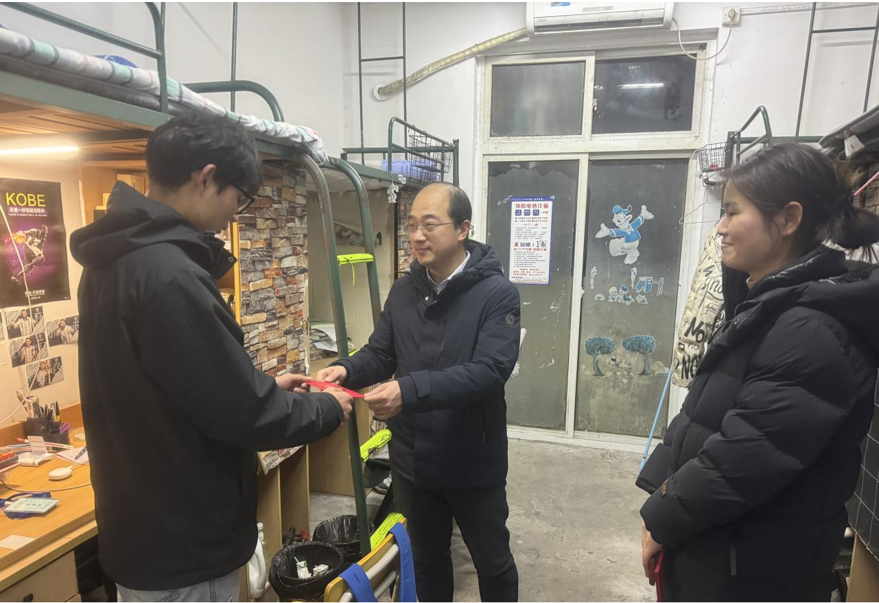 走访过程中,王玮代表学院为留校学生送上了新春祝福与慰问红包,详细询问了留校学生的学习和生活情况,叮嘱同学们留校期间要增强个人安全意识,重视日常生活安全,遵守宿舍管理规定,注意劳逸结合,保持身心愉悦。他强调,同学们在校要互帮互助,遇到困难及时联系辅导员,学院将切实帮助同学们解决问题。