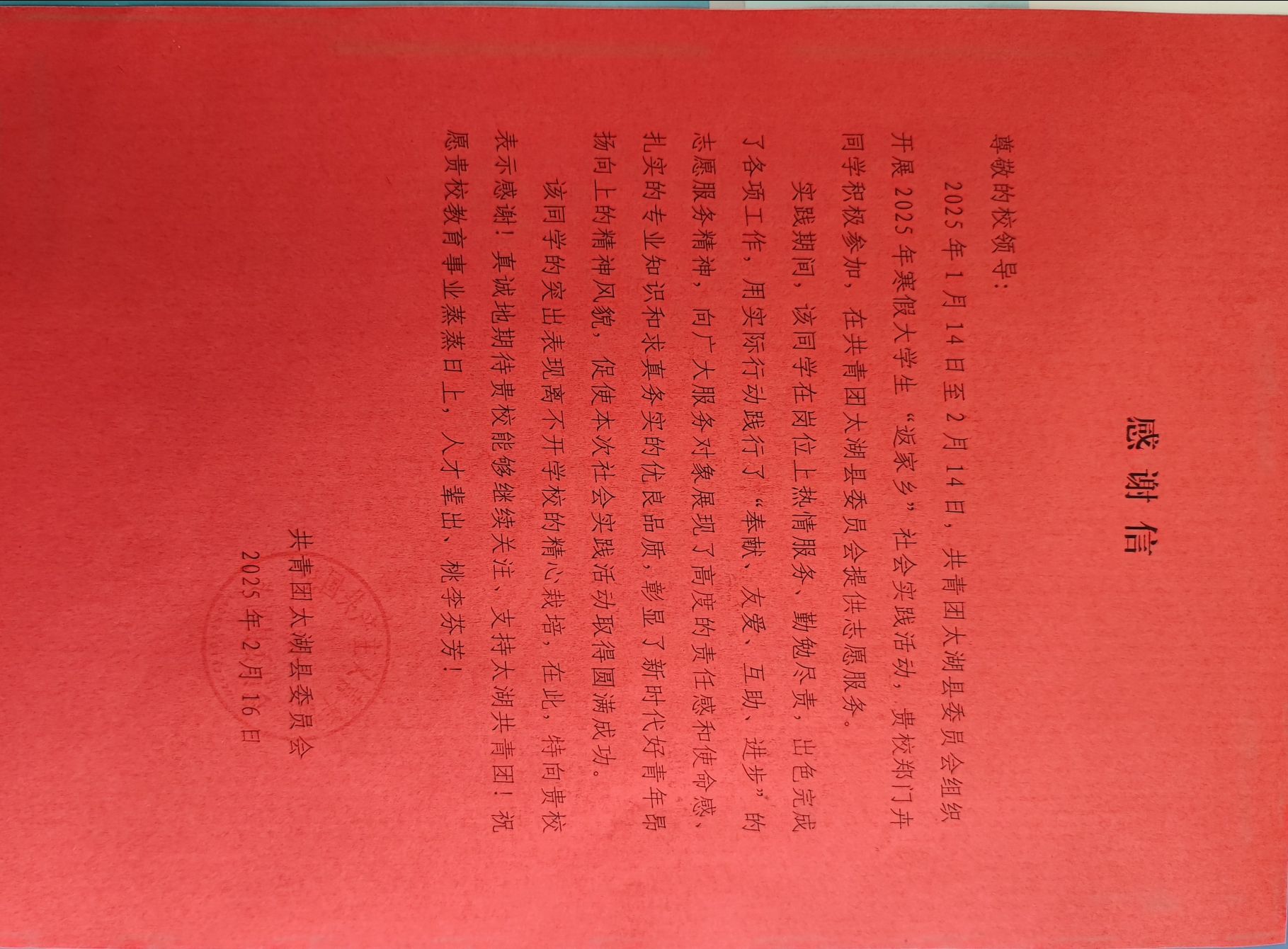 人文学院团委大力推动大学生“返家乡”社会实践活动。同学们通过“创青春”公众号“返家乡”栏目踊跃报名,或自行联系家乡实践单位,深入基层一线。2023级学科教学(语文)郑门卉同学在太湖南站开展为期一个月的志愿服务工作,以良好的沟通能力、组织协调能力协助工作人员维持车站秩序,为出行旅客提供悉心的帮助。近期,人文学院团委收到来自团太湖县委员会的感谢信,信中对郑门卉在实践志愿服务工作中的表现予以高度的评价和赞扬。