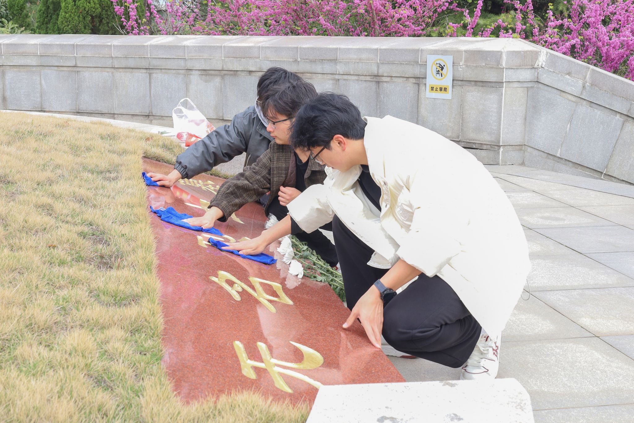 祭扫当日,学生们列队肃立于烈士纪念碑前,将纸花与鲜花交错敬献于碑座。献花后,他们俯身用清水与软布仔细清理碑上尘埃,轻读镌刻的姓名与生平。“21岁的陈延年烈士、20岁的陈海溪烈士……他们牺牲时和我们年龄相仿。”设计学类专业2024(2)班的王婧怡擦拭墓碑时眼眶微红,“很多烈士并非安庆籍人,却将热血洒在这里,如今的岁月静好是太多无名英雄换来的。”经过近两个小时的清扫,百余座墓碑重现光泽。