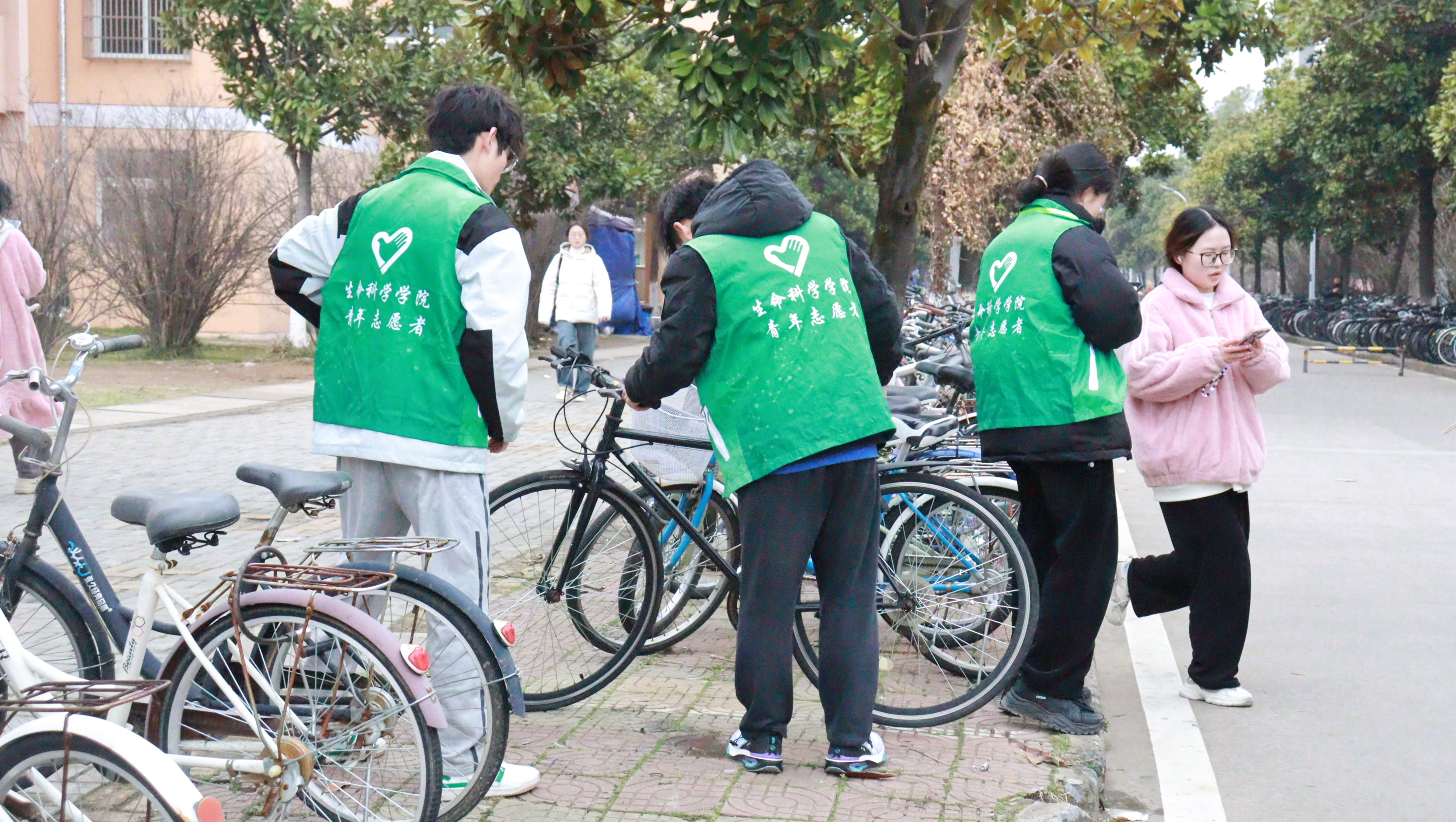 3月5日,2024级生物科学类4班全体同学发起“净湖行动”,40余名学生手持垃圾夹、环保袋,对校园双龙湖周边、绿化带进行“地毯式”清理。同学们分组协作,捡拾塑料瓶等废弃物,并分类投放到垃圾站。活动累计清理垃圾10余袋,同时通过现场讲解垃圾分类知识,呼吁更多人关注环境问题。当天,绿叶志愿服务队在东苑食堂门口开展了一场以“扶正的车轮,滚动春日的善意”为主题的志愿服务活动,在按照预先划分好的区域内,有条不紊地开始扶起倒地、停放不规范的自行车。“弯腰捡起的不仅是垃圾,更是对地球的责任。扶正的不仅仅是车轮,更是春日的善意。”2024级生物科学专业单麟涵说道。