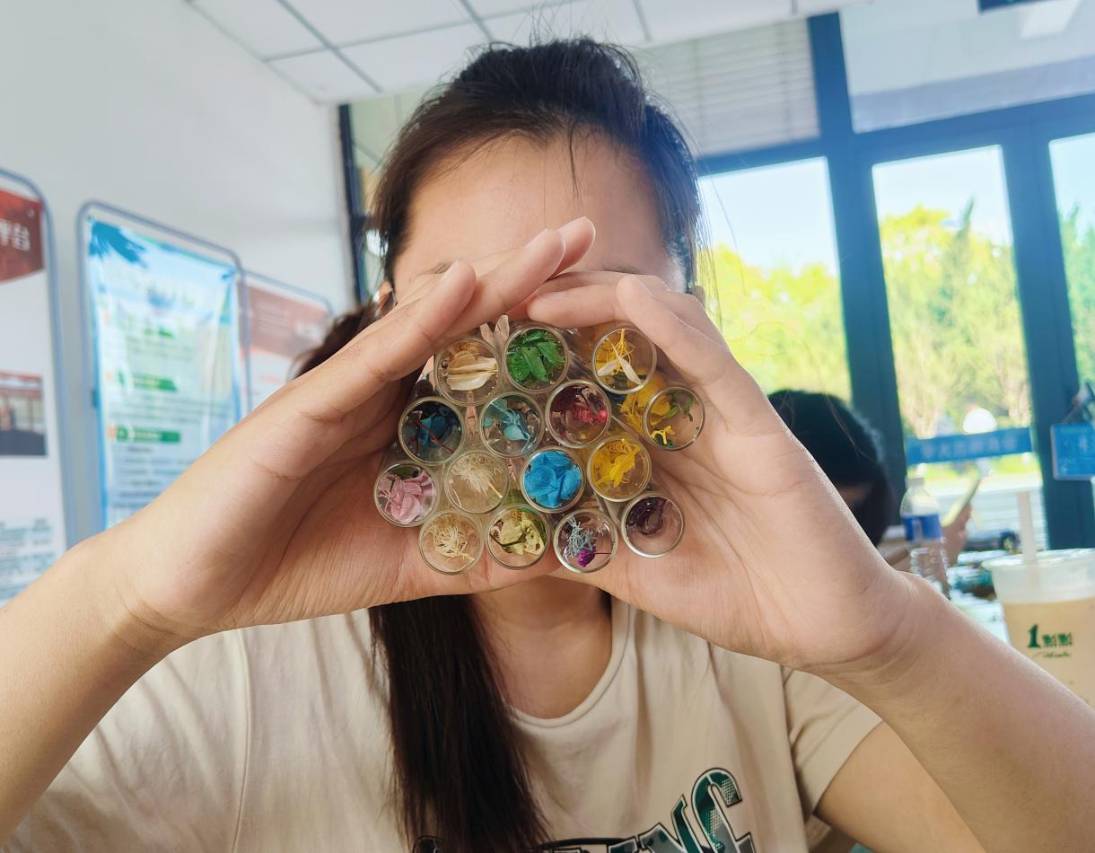 手执玻璃细挑选、编织干花释压力、分享心事互倾听……工作人员引导学生使用干花在玻璃瓶里进行创作,同学们充分展示自己的创作,表达内心想法。工商管理类专业2024级(2)班的郭笑彤同学表示,“在挑选自己心仪的干花和思考如何创作中,让我在释放情绪压力的同时体验到了感受到创作的魅力。”财务管理专业2023级(1)班的李嘉怡同学在完成创作后兴奋地说道:“通过这次活动,我不仅缓解了压力,还结识了一群志同道合的朋友。”