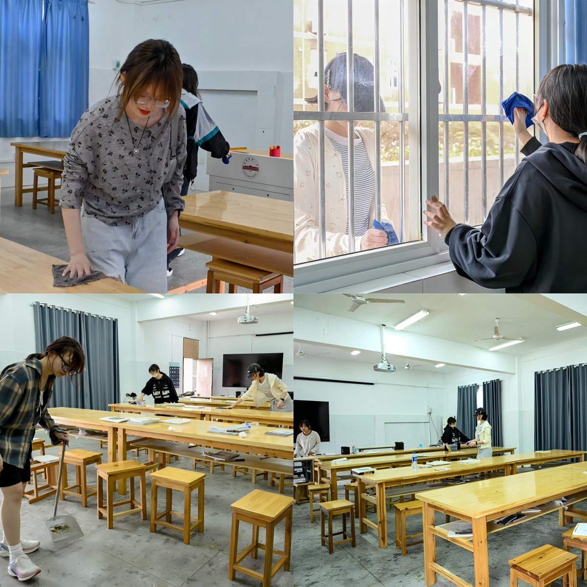 手持抹布、扫帚等工具,分工有序、“针对性”出击,活动当天,学生们展开清扫,在美术楼洗手池、教室、楼梯口等地来回穿梭。把抹布叠出一个角,加上清洁剂,巧妙擦除窗台污渍……美术学专业2024(3)班的童瑶转过身调整姿势,为清理窗户找寻最佳角度。经过不懈努力,窗户“焕然一新”。童瑶说道:“虽然这个过程有些辛苦,但看到明亮的窗户,我的内心充满了成就感。”她表示,平日执着于画布上的色彩与构图,却鲜少关注画室环境的维护,“擦拭玻璃的耐心和调整画笔的力度一样,都是创造美的必修课。”