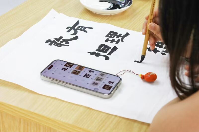 铺开白纸、研墨提笔,与会人员围坐在会议桌前,以书法创作形式写下体会。美术学专业2021(2)班学生党员卞鑫现场临摹邓石如隶书字体,写下了“有理想、敢担当、能吃苦、肯奋斗”十二个字,她收起笔墨时感慨道:“作为新时代大学生,我们应坚定理想信念,将小我融入大我。”