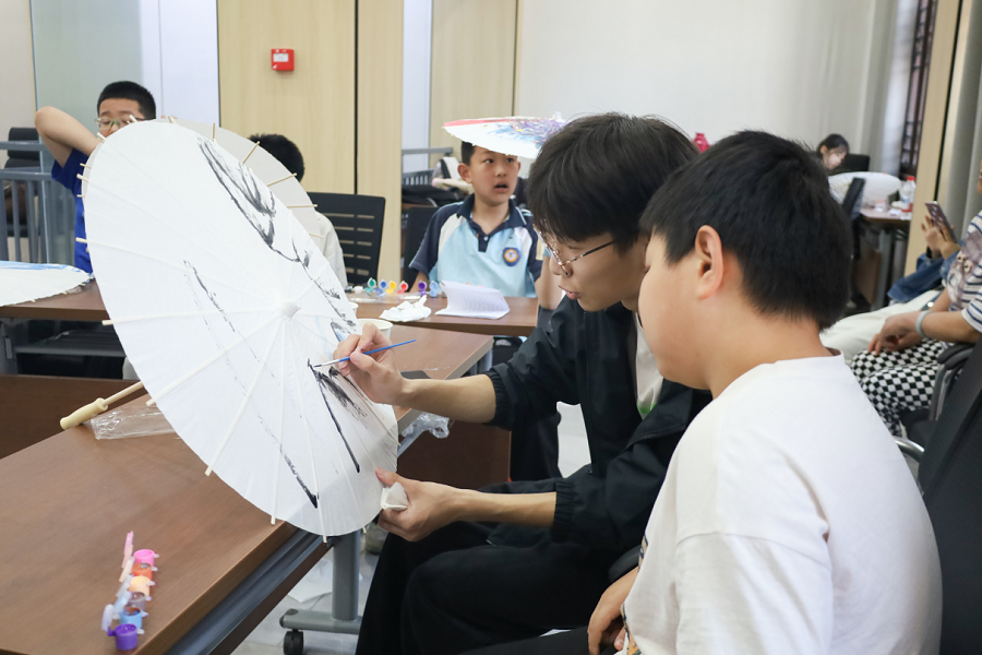 “先撑开伞面,再根据构思调试颜料,上色过程要有耐心不能急躁。”教学过程中,志愿者、电子商务类专业2024(1)班的汪浩边示范边讲解。谈及准备工作,这位已有绘画功底的“小老师”说:“提前三天就开始琢磨配色和笔法了,希望能为社区参与者带来最佳体验。”在他一笔一画的耐心指导下,一幅虚实相生的山水图景悄然“绽放”在五年级(2)班丁文博的画纸上。