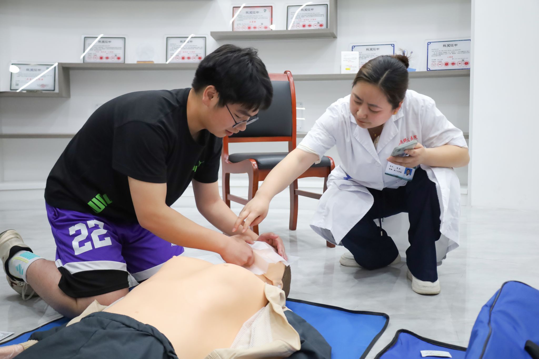“开展急救措施的第一步是要评估环境安全,第二步是做好个人防护,确保自身的安全后再进行下一步。”校医院医生陈忱边讲解边为学生们示范着动作。轻拍重唤、听呼吸、观察胸部是否起伏……陈忱一步步指导学生们如何判断伤者是否需要急救,如何进行急救。“急救的同时要积极寻求周围人的帮助,并指定某人拨打120急救电话。”急救时的要点陈忱都一一指出来。