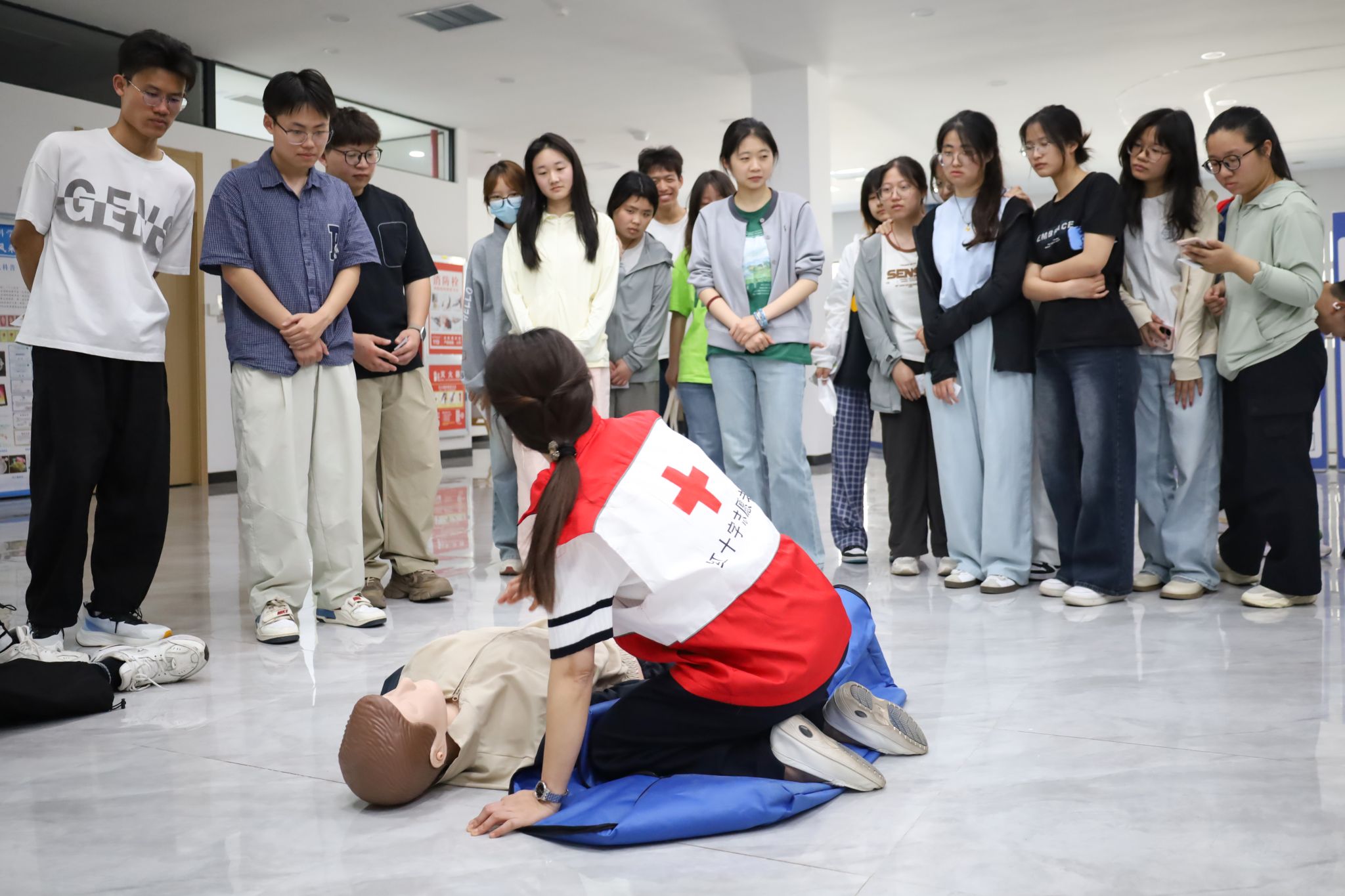 近日,在第78个“世界红十字日”来临之际,数理学院联合校医院在龙山校区“一站式”学生社区举办急救知识培训活动。百余名学生到场参与,在聆听讲解与实操训练中学习与掌握急救知识。