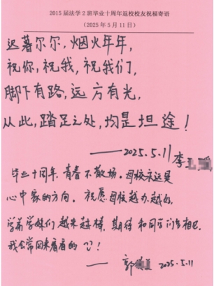 李丹主持座谈会。张宗高分享了与校友们共同成长的难忘经历。与会校友纷纷发言,回忆了在校学习的点滴时光,畅谈毕业十年间的工作经历与人生感悟。校友们结合自身在司法机关、律所以及企业法务岗位的工作经验,围绕法学实践教学、校企协同育人、校友资源共享等提出了宝贵的建议和意见,现场气氛热烈融洽。活动还特别设置了“手写祝福寄语”环节,校友们在明信片上写下对母校的祝愿与对学弟学妹的期许,字字真挚,句句情深。